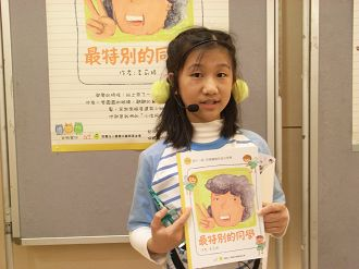 「阿嬤是我的同班同學」、「分享榮耀盛過獨自擁有」是這次用愛彌補兒童文學獎要分享的故事,獲得金獎的百齡國小李莉婷小朋友作品是「最特別的同學」,描寫班上的同學小信,因為有高功能自閉症和過動的傾向,必須由家人陪同上學,父母親工作煩忙,陪伴的責任就落到阿嬤身上,阿嬤成為班上另類的同學,陪著大家一起上課、打掃。
