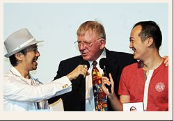羅慧夫顱顏基金會20週年慶25日在台北舉行,專程回台的羅慧夫醫師(中)與唇顎裂患者歌手Yuji(左)及音樂人邱柏蒼(右)相見歡。羅慧夫讚賞他們已變成帥哥。中央社記者施宗暉攝98年10月25日