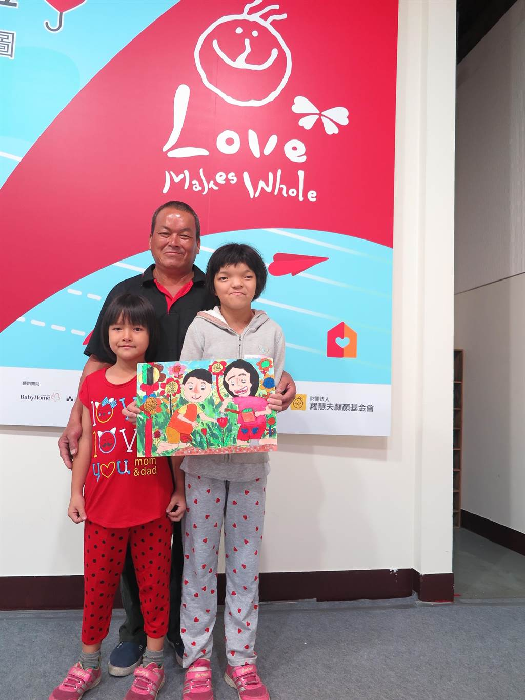 12歲的鄭惠方與家人,手拿創作作品「愛心的照顧」。(羅慧夫顱顏基金會提供)