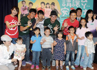 羅慧夫顱顏基金會「每個孩子都是我的寶貝,請讓ㄊㄚ安心長大」記者會,14日在台北國際藝術村舉行,藝人小8(後左起)、惟毅等人一起為顱顏小朋友加油。中央社記者施宗暉攝 101年4月14日
