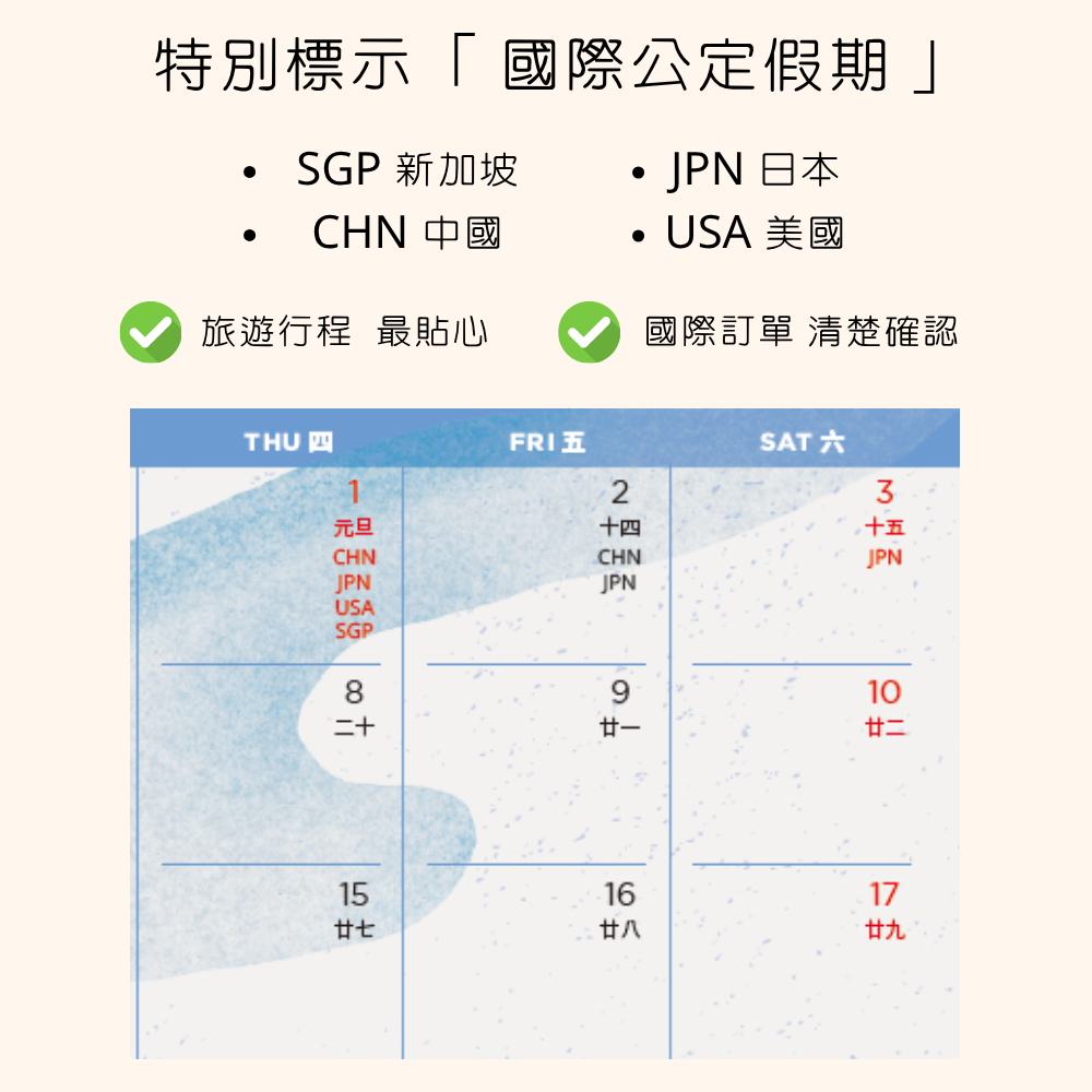 特別標示國際公定假期,海外訂單清楚確認,假期也能輕鬆預定