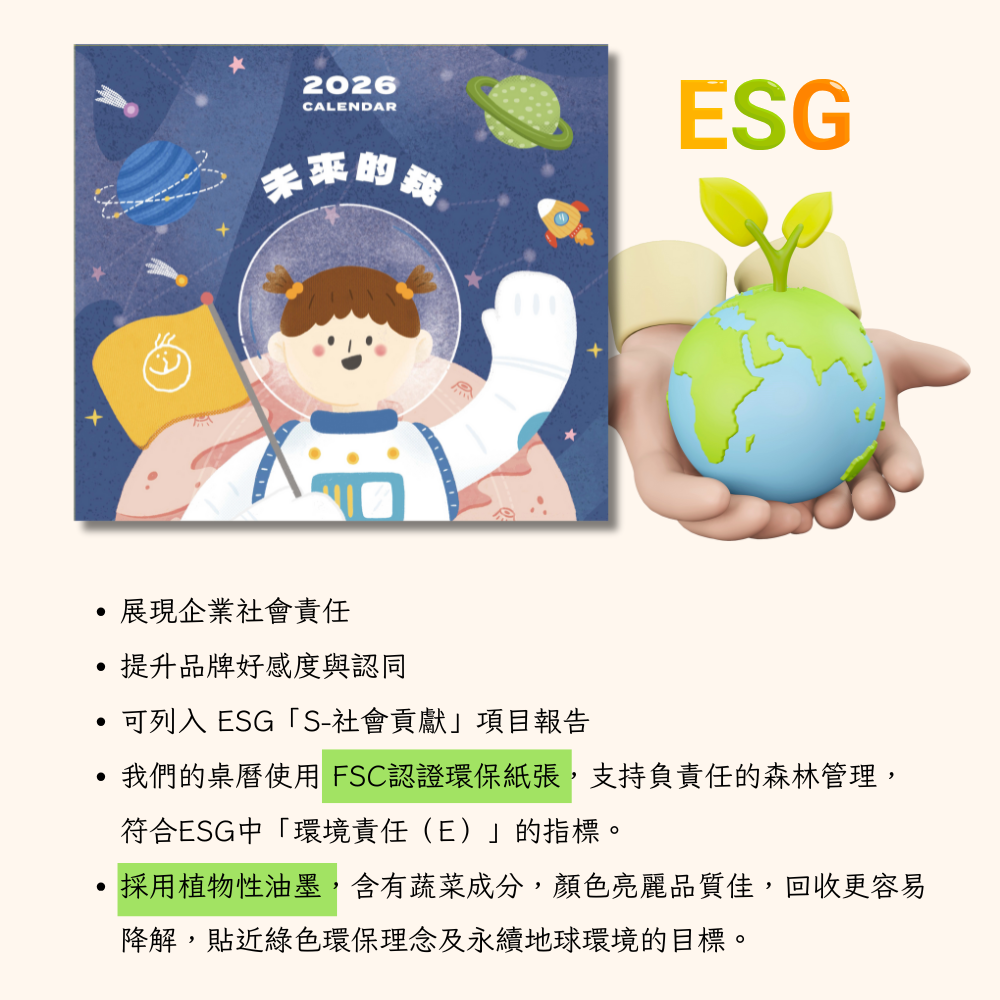 ✅ 我們的桌曆使用FSC認證環保紙張,支持負責任的森林管理,符合ESG中「環境責任(E)」的指標。