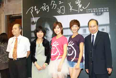 羅慧夫顱顏基金會執行長王金英(左二)與基金會董事長黃烱興醫師(右一),為義診紀錄攝影展留下見証。(圖片提供/羅慧夫顱顏基金會)