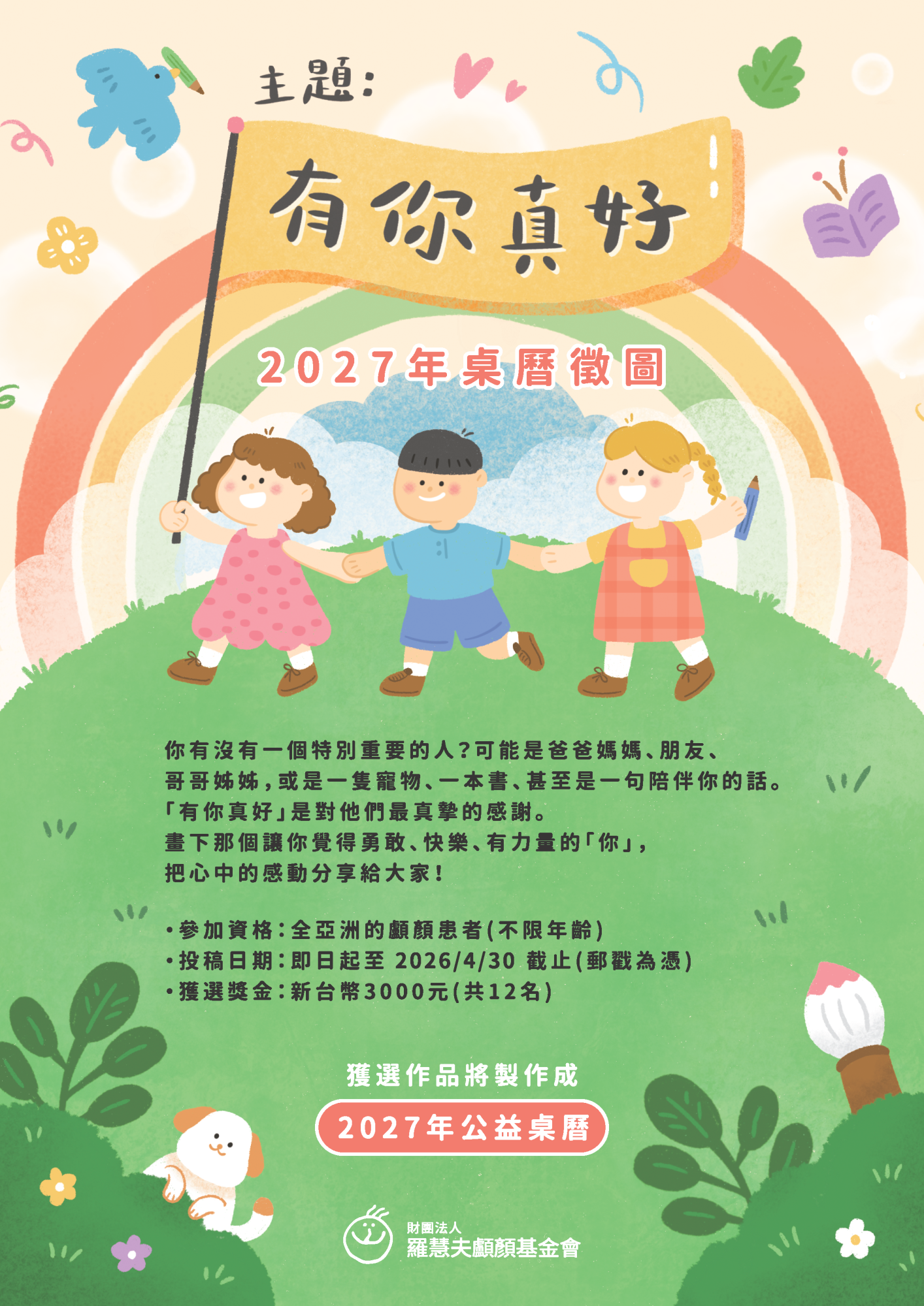 親愛的顱顏孩子們,2027年的公益桌曆徵件活動正式啟動!🎨🌟