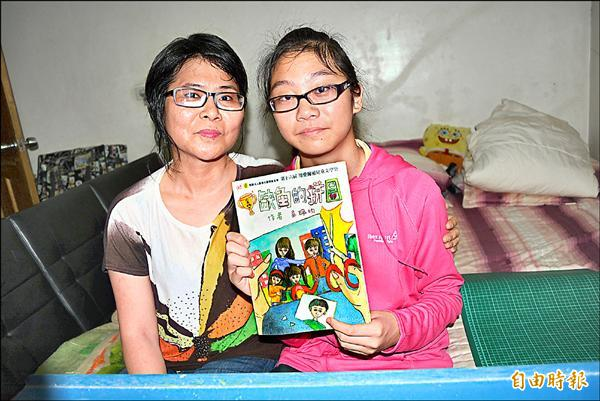 大村國小女學生吳珮均(右)允文允武,她的著作「缺角的拼圖」描述自己的生活遭遇,圖文並茂,讓母親相當感動。(記者湯世名攝)