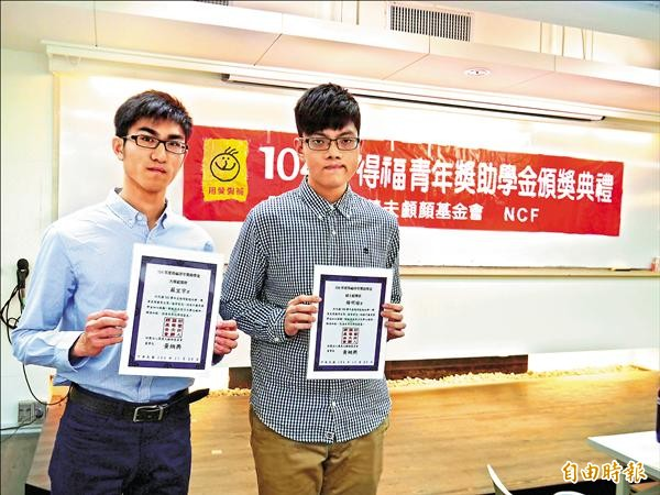 蘇宣宇(左)、楊明瑜(右)突破唇顎裂困境努力向學,昨日獲頒羅慧夫顱顏基金會得福獎助學金。(記者林惠琴攝)