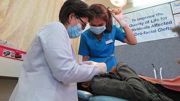 高中畢業後的過渡期,荃虹(右一)利用空餘時間,協助本會矯正牙科種子醫師Dr. Sythan(左一)的門診工作,並以她自身的經驗鼓勵唇顎裂患者。