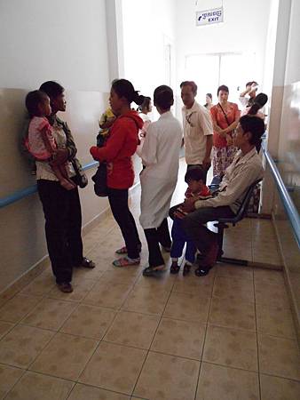 瓦納醫師幫病患拍照,紀錄治療狀況。後方為社工師Alin / 醫院長廊上排隊等候的病患