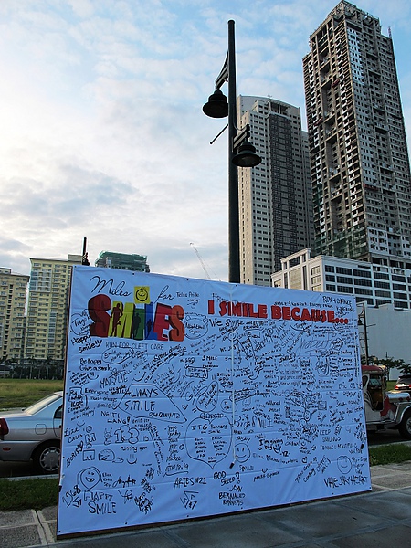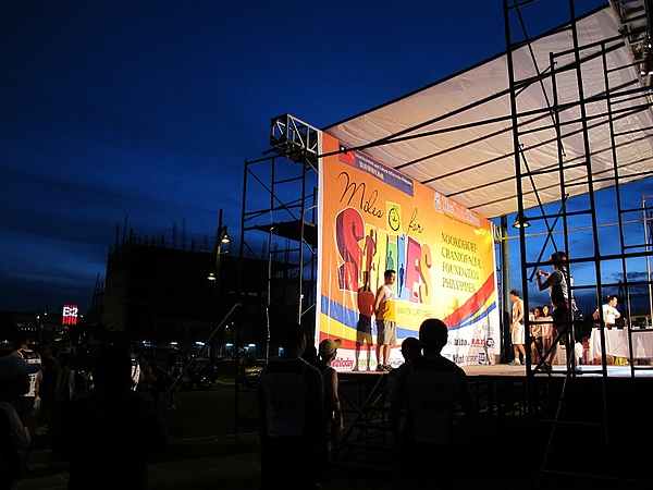 清晨三點,夜色正濃,暗黃的路燈指引著志工們邁向天明,一起辛勤地為了「Miles for Smiles」路跑活動、為了菲律賓每個唇顎裂的可愛患童而付出心力,散落一地的標示、路牌、氣球及紀念禮品,在菲律賓羅慧夫顱顏基金會工作團隊及志工們勞心勞力犧牲睡眠下,一一就了定位,一團團印有微笑圖案的各色汽球,也飄在馬尼拉市區的半空中,在灌入滿滿的愛後,汽球上的微笑在金黃燈光的夜色中,更顯燦爛。