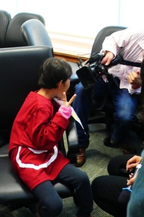 圖:米杜成為全場焦點,但是小小年紀她並不怯場,正努力與記者姐姐溝通中。