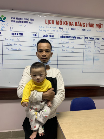 阿迪出生後,爸媽就帶他到鄰近的順化醫院進行手術諮詢,得知手術費用、評估家中經濟狀況後,阿迪爸媽決定等待申請手術費用的補助;然而,卻遲遲未收到手術補助相關公告。阿迪爸爸決定上網找尋其他唇腭裂治療院所,因此搜尋到國家兒童醫院。阿迪爸爸主動聯繫國家兒童醫院Lan醫師-他是基金會培訓之越南種子外科醫師。電話中,Lan醫師不僅提供專業醫療諮詢,更不斷安撫阿迪爸爸緊張不安情緒,讓疼愛兒子的阿迪父親重燃希望。更令阿迪爸媽喜出望外的是,手術費用竟然完全免費。這對於收入不穩定的阿迪爸媽來說,是天大的好消息。