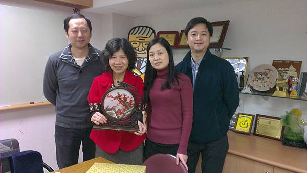 李力護理師(圖右二)與該院外科醫師王鎧(圖左一)、矯正牙科醫師肖立偉(圖右一)拜訪本會。圖左二為本會執行長王金英女士。