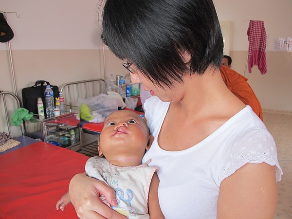 小女嬰是此次金邊義診的最後一檯手術,在麻醉後送進了開刀房,媽媽穿著綠色的無菌衣坐在術前準備室中等待,顯得有些無助,過不一會兒,她焦急地開始啜泣,為人母的擔心與煎熬在準備室中滿溢,我鼻子一酸,無奈只能伸出雙手擁抱,阿琳見狀,沉穩地開始用言語安撫,平靜地解釋無數成功案例,我的「蘇ㄜ司爹」完全派不上用場,心裡只慶幸著,幸好基金會也用心培育了社工兼臨床協調員,能給這些特別的父母們,多一些些支持。