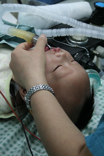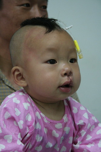 麻醉成功,看著他頭上的一撮毛,很快的醫生叔叔們就會給他一張漂亮的臉了,再一個小時~~~