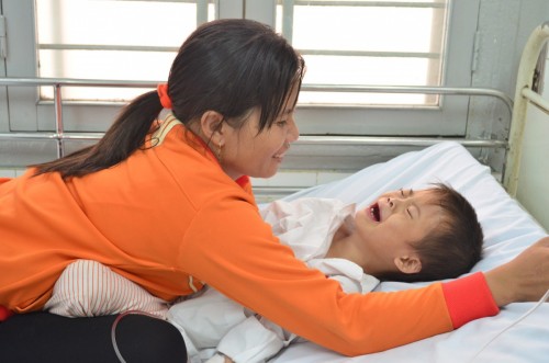 他很焦慮,不斷地把病歷表扔到地上,媽媽阮氏秋草蹲下身撿起,他拿著在手上把玩一會兒又往地上丟。不斷地重複這個動作,媽媽蹲下、起身、蹲下、起身…。很明顯地阮友寶南和其他患童不一樣,白晰的皮膚、過寬的眼距、眼神無魂地只剩下自己。